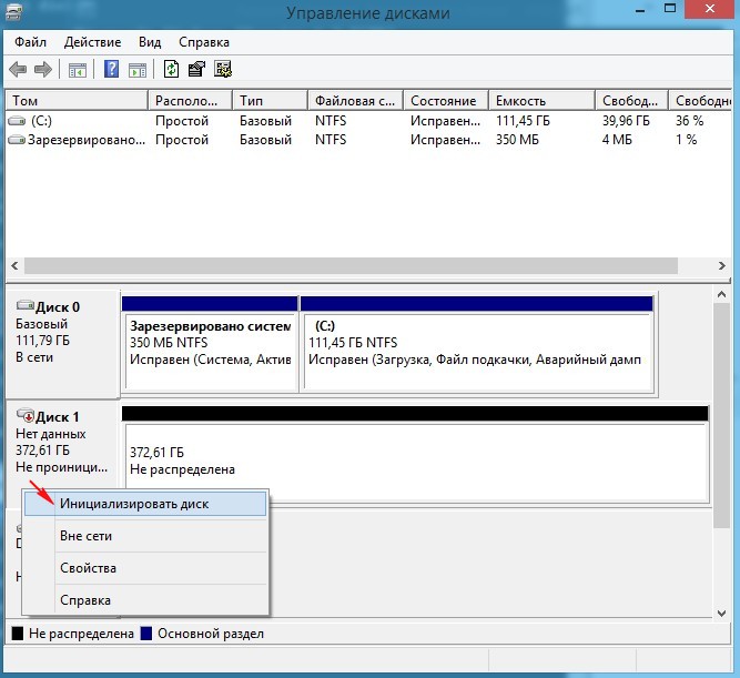Перед созданием одного единственного раздела диск нужно инициализировать. Щёлкаем на Диске 1 правой мышью и выбираем Инициализировать диск.