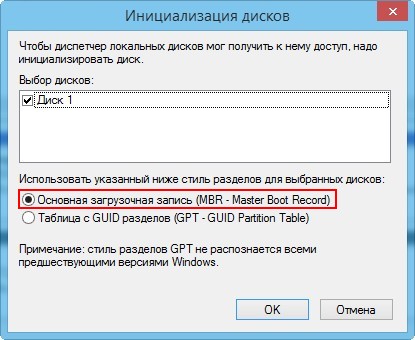 Если вы не знаете что такое GPT, то выберите Основная загрузочная запись MBR и нажмите ОК..