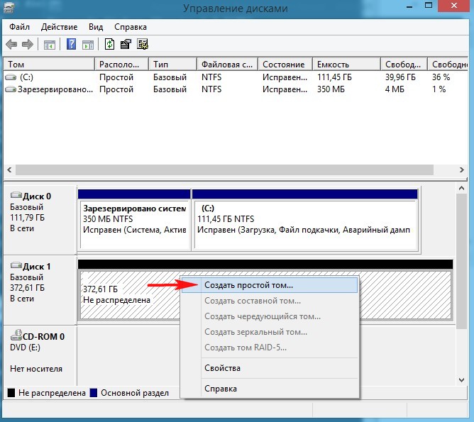 Теперь создаём простой том. Щёлкаем правой мышью на нераспределённом пространстве и выбираем Создать том.
