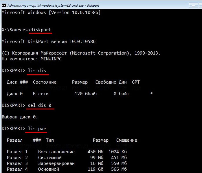 sel dis 0 (выбираем жёсткий диск с установленной Windows 10)