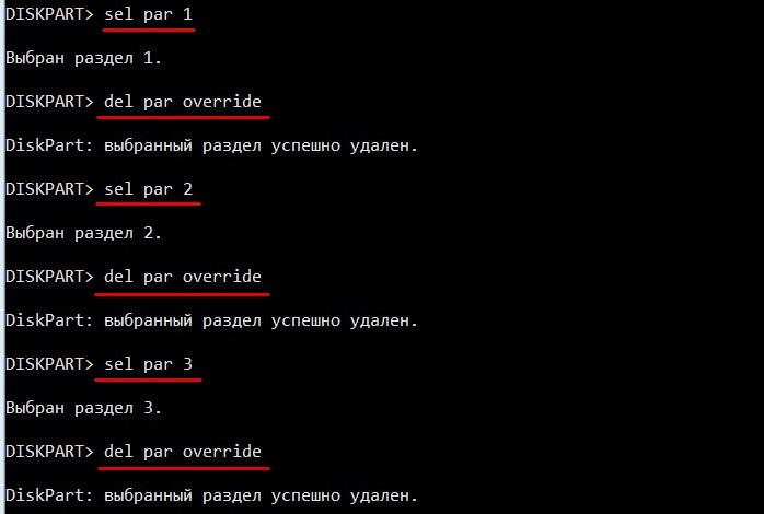 Следующими командами удаляем первые три скрытые раздела Windows 10: