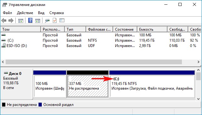 Смотрим управление дисками. Нам осталось присоединить нераспределённое пространство к диску (C:).