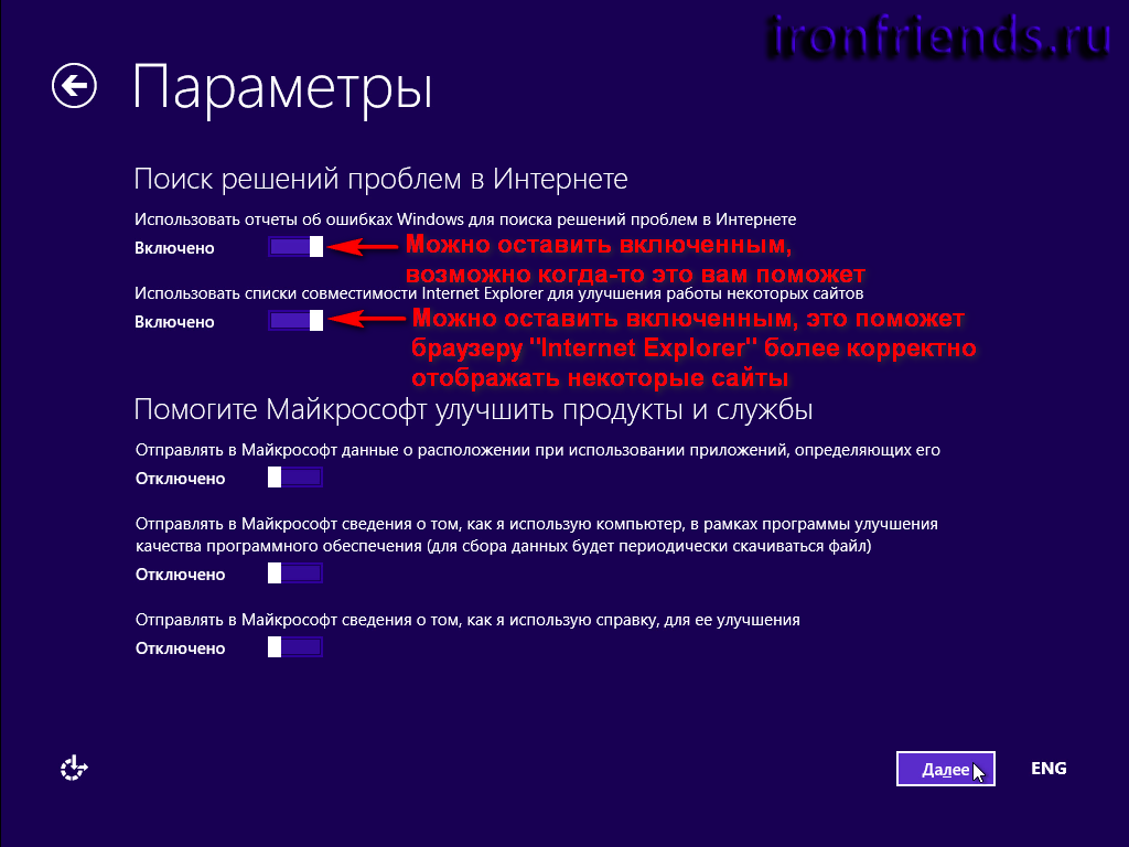 Следующая страница установки, это «Параметры», думаю что настроить компьютер можно позже, а сейчас советую выбрать «Использовать стандартные параметры».