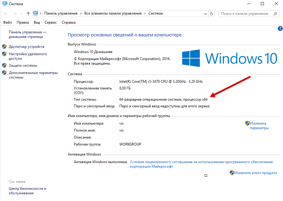 Шаг 2. В открывшемся окне, мы может прочитать свойства компьютера, версию операционной системы и её разрядность 32 (х86) или 64 бит. В нашем случаи стоит 64-разрядная операционная система Windows 10.