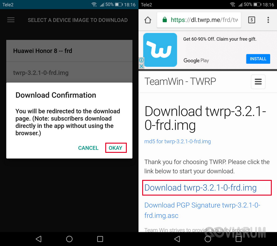 Подтверждаем переход на официальный сайт TWRP, с которого загружаем файл Recovery.