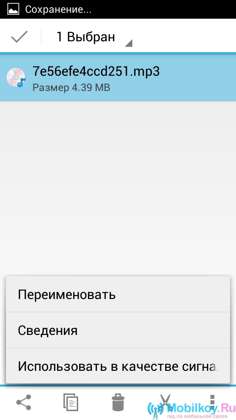 - Стоит отметить, что многие файловые менеджеры и музыкальные приложения на телефоне поддерживают функцию установки мелодий на звонок и вам нужно всего лишь найти файл рингтона, сделать долгое нажатие и выбрать «Установить в качестве мелодии звонка».