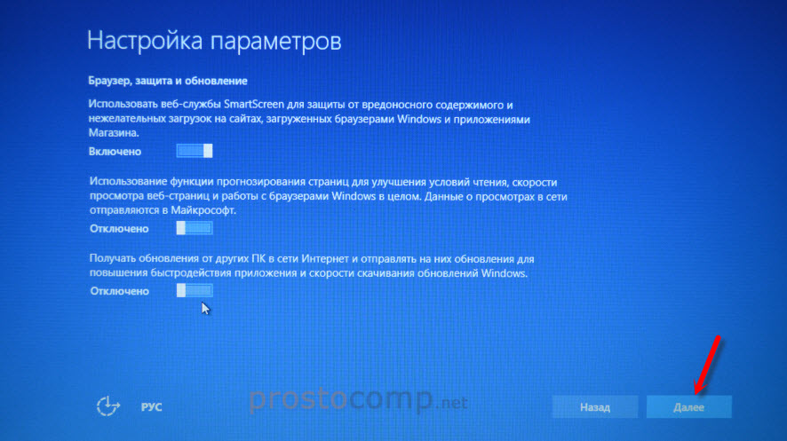 5. Примите рекомендуемые параметры или отклоните их, чтобы задать свои предпочтения, и нажмите кнопку Далее .