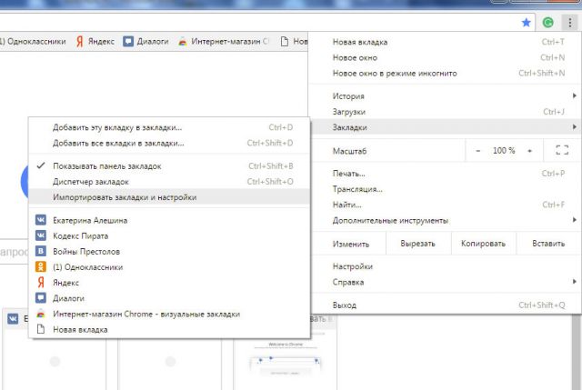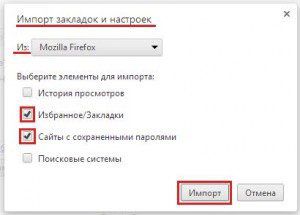 1.Закройте окно Mozilla FireFox. В меню Гугл Хром выберите «Закладки», а далее – «Импортировать закладки и настройки».
