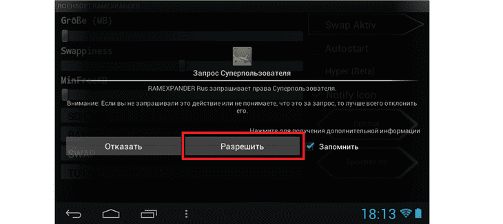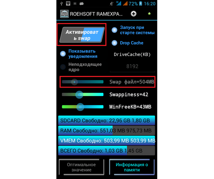 Существует одно очень интересное приложение ROEHSOFT RAMEXPANDER, которое позволяет создать файл подкачки объемом до 2,5 Гб, при этом освобождая ОЗУ для более ресурсоемких приложений. Перед использованием обязательно проверьте устройство на совместимость с приложением с помощью другого приложения под названием MemoryInfo & Swapfilecheck. Также напоминаем, что для функционирования ROEHSOFT RAMEXPANDER нужны .