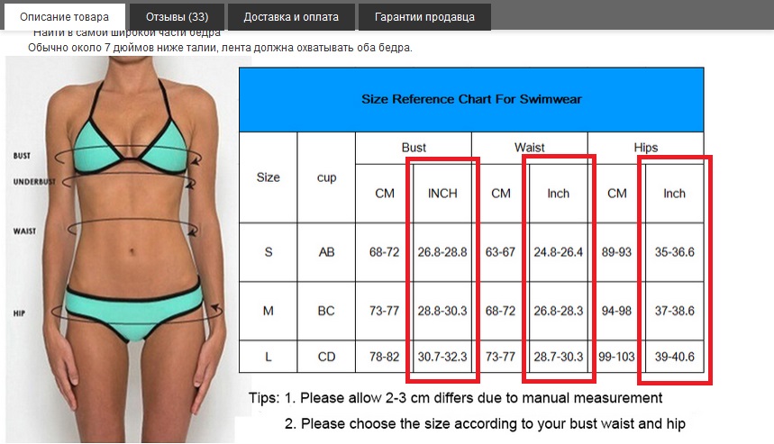 Вся необходимая информация о размере женской одежды содержится под описанием одежды, где обычно сразу размещается таблица размеров для этой вещи. В ней обычно указываются основные параметры и их замеры, либо в сантиметрах, либо в дюймах. Фактические данные обычно отличаются на несколько сантиметров от замеров в таблице, но нужно также помнить, что размерная сетка содержит азиатский размер, а значит он даже меньше, чем указано в таблице. В качестве ориентира всегда используйте правило прибавлять к своим объемам несколько сантиметров, так как вещь должна быть всегда немного свободной. Руководствуясь этим правилом выйдет, что нужно брать одежду на размер больше, чем обычно. Если вещь идет в одном размере, то на XS-S она может сесть отлично, а на М-ку уже быть маленькой. Многое при выборе размера женской одежды на Алиэкспресс зависит от того, как вы хотите, чтобы вещь села: впритык или свободно. Всегда уточняйте у продавца размер перед покупкой.