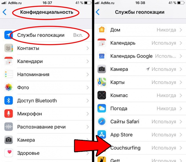 В разделе под названием «Службы геолокации» вы можете увидеть, что категории доступа к информации в девайсе у каждой утилиты установлены свои: