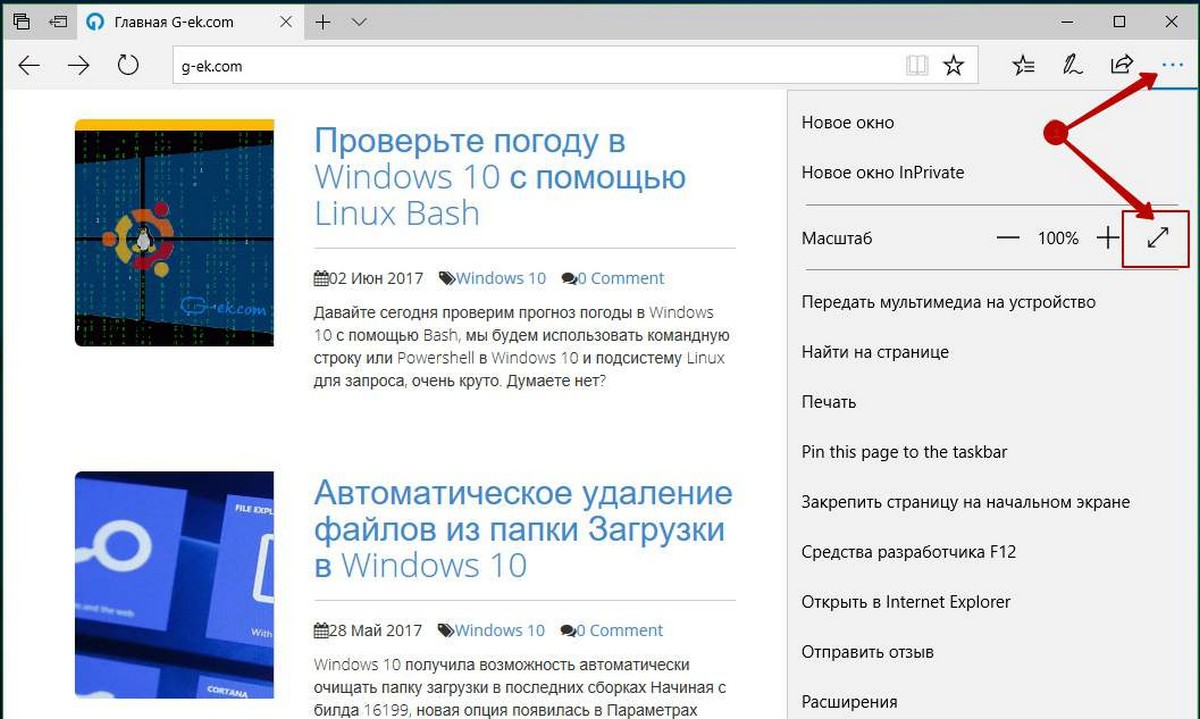 Хотя Microsoft Edge постепенно превращается в отличный веб-браузер, одна из его прежних проблем заключается в том, что у него не было интуитивно понятного метода, позволяющего запускать его в полноэкранном режиме. Если вы не видите опцию масштабирования, опубликованную ранее, значит, у вас более старая версия Windows 10. К счастью, вот способ заставить Microsoft Edge работать в полноэкранном режиме, и это не так сложно: вы должны одновременно нажать Windows. + Shift + Enter клавиш на клавиатуре.