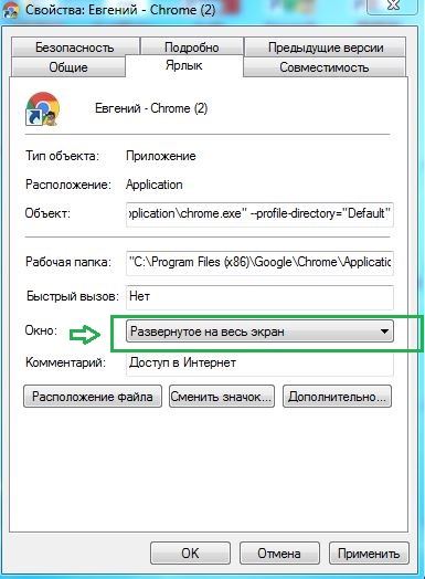 - в строке «Окно» выставляем «Развёрнутое на весь экран»…