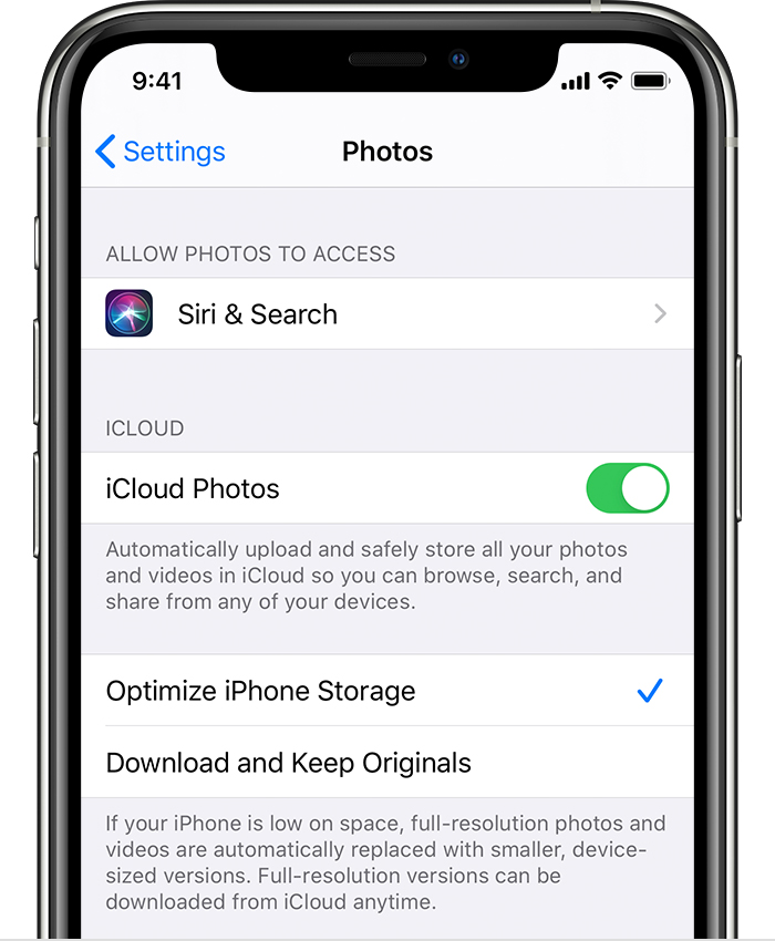 Функция «Фото iCloud» хранит все ваши фотографии и видео в исходной версии с высоким разрешением. На устройстве можно сэкономить место с помощью параметра «Оптимизировать хранилище».