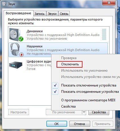 - В списке устройств воспроизведения нажмите правой кнопкой мыши и отметьте пункты «Показать отключенные устройства» и «Показать отсоединенные устройства».
