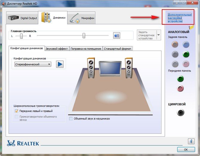 - Если у вас звуковая карта Realtek, загляните в раздел «Динамики» приложения Realtek HD. Включите правильную конфигурацию (например, стерео), а в «дополнительные настройки устройства» установите отметку на «Отключить определение гнезд передней панели» (даже если проблемы возникают при подключении к задней панели).
