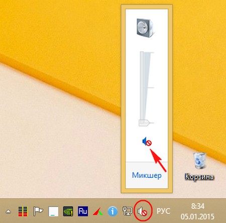 Причиной, почему пропал звук на Windows 8 (8.1), может быть выставленный на минимум уровень громкости в системном трее (правая часть панели задач) или вовсе отключённый звук. Точно так, как и в случае с возможным отсоединением штекера аудиоколонок, такое случается из-за шалости детей или домашних питомцев, а также случайных действий неопытных пользователей. Кликните изображение звука в системном трее и проверьте уровень громкости.