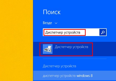 Чаще, нежели полное отсутствие драйвера звуковой карты, причиной проблемы, почему пропал звук на Windows 8 (8.1), является некорректная работа драйвера. В этом случае решением может стать его обновление. Чтобы обновить драйвер звуковой карты, нам потребуется диспетчер устройств системы. Для этого воспользуемся Metro-поиском Windows 8 (8.1), который появляется при касании к краю экрана справа. Вводим запрос «Диспетчер устройств» и запускаем службу.