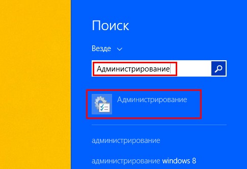Причиной, почему пропал звук на Windows 8 (8.1), может быть незапущенная системная служба Windows Audio, взаимодействующая со звуком. Необходимо проверить, запущена она или нет, и, если нет, то, соответственно, нужно её запустить. Касанием к правой части экрана вызываем Metro-функционал Windows 8 (8.1), кликаем поиск и вводим в строку «Администрирование». Запускаем этот раздел системы.