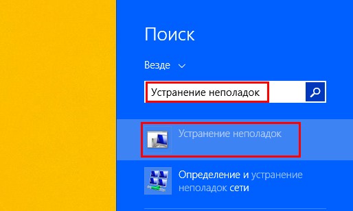 Друзья, также как и в Windows 7 в Windows 8 имеется универсальное средство диагностики неисправностей и Вы можете с успехом его использовать для выяснения причин отсутствия звука в Вашей операционной системе. В третий раз воспользуемся Metro-поиском Windows 8 (8.1), уводим указатель мыши к краю экрана справа, выбираем «Поиск» и вбиваем в нём «Устранение неполадок»