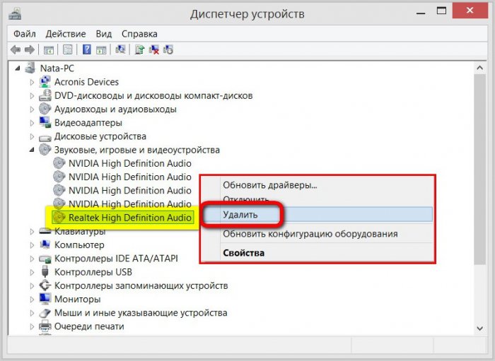 Если обновление драйвера звуковой карты не дало результатов, драйвер можно удалить вручную и установить его заново, как указано в п. 4.1. Для удаления драйвера выбираем в диспетчере устройств устройство High Definition Audio, вызываем контекстное меню и жмём «Удалить».