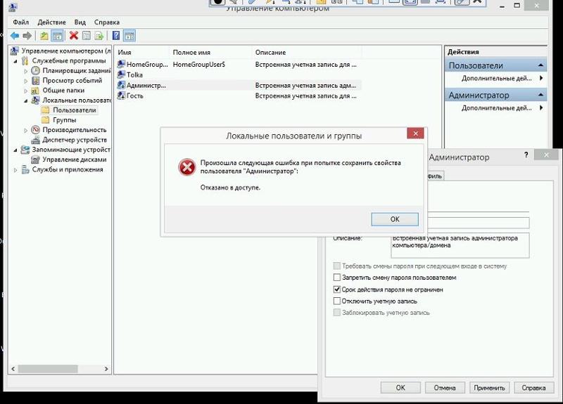 Отключить учетную запись Администратора не получается, пишет отказано в доступе. Помогите.