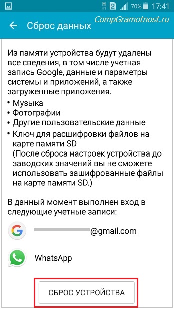 - возвращение смартфона к заводским настройкам с форматированием памяти;
