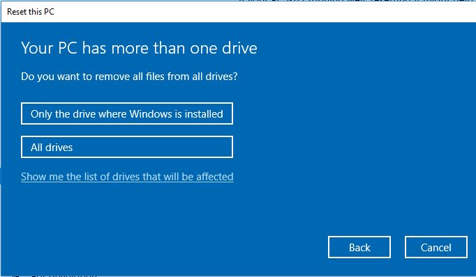 Если вы используете Windows 10 1809 или любую более раннюю версию, вы не сможете получить доступ к этим двум настройкам, нажав Изменить настройки . Вместо этого вы последовательно получите следующие интерфейсы, которые потребуют от вас соответствующего выбора: удалить все файлы только с системного диска или со всех дисков и очистить диски.