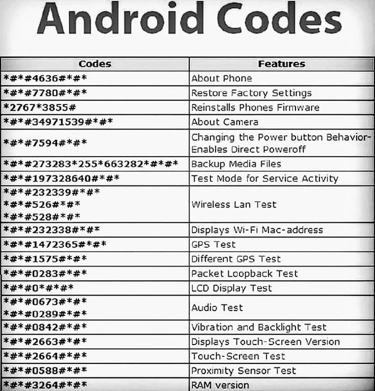 Большая часть из указанных кодов считаются общими для многих версий андроид и мобильных приспособлений.