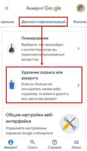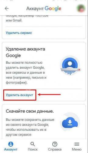 - Найдите блок “Скачивание, удаление и планирование” и в нем нажмите на “Удаление сервиса или аккаунта”.