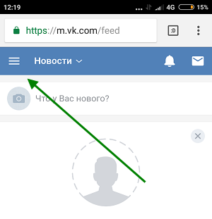 1. Заходим в мобильную версию ВКонтакте с любого браузера, далее кликаем по значку «Меню», в верхнем левом углу страницы.