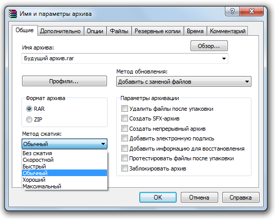 Если вы новичок, обращайте в первую очередь внимание на параметр Уровень сжатия. Чем выше уровень, тем больше места вы сэкономите, но при этом компьютер потратит больше времени на сжатие. Также можно выбрать один из форматов в списке Формат архива. Совет: формат 7z эффективнее остальных сжимает файлы при архивации.