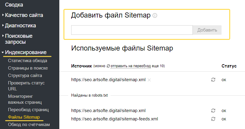 Также рекомендуется продублировать ссылку на файл Sitemap в robots.txt — ее можно найти в корневом каталоге сервера.