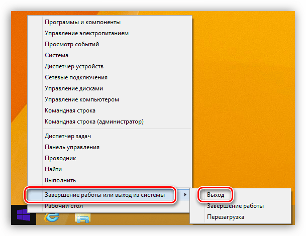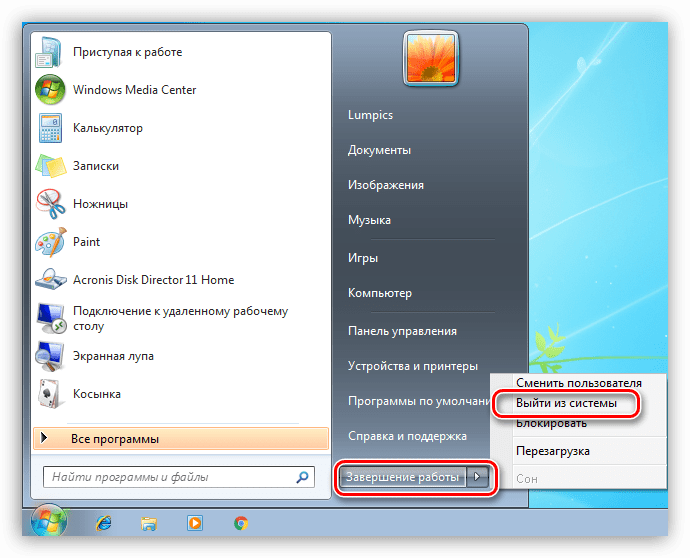- Снова идем в меню «Пуск» и нажимаем «Выход из системы»