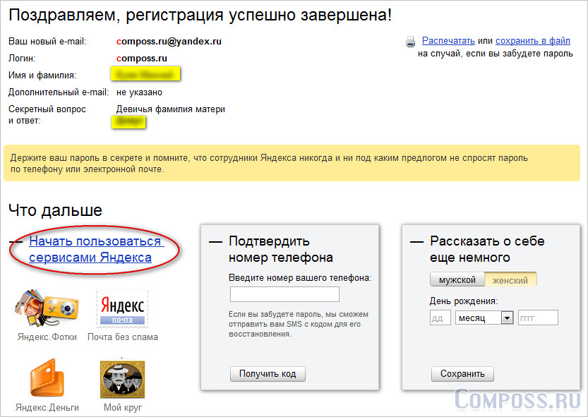 Когда все данные будут введены, следует нажать на кнопку «Зарегистрироваться». На этом этапе регистрация ящика на яндексе завершается. Теперь пользователь может добавить фотографию учётной записи и, при необходимости, ввести дополнительную информацию о себе. Чтобы дополнительно обезопасить почту, необходимо привязать к учётной записи мобильный телефон(если это не было совершено ранее), а также запасную почту, если таковая имеется.