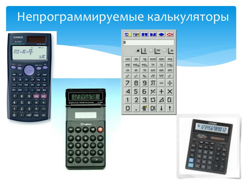 - Программируемые калькуляторы по их возможностям можно назвать сложными инженерными калькуляторами. Они способны выполнять те же функции, а также дополнительно делать повторные сложные вычисления, выполнять создаваемые пользователями программы.