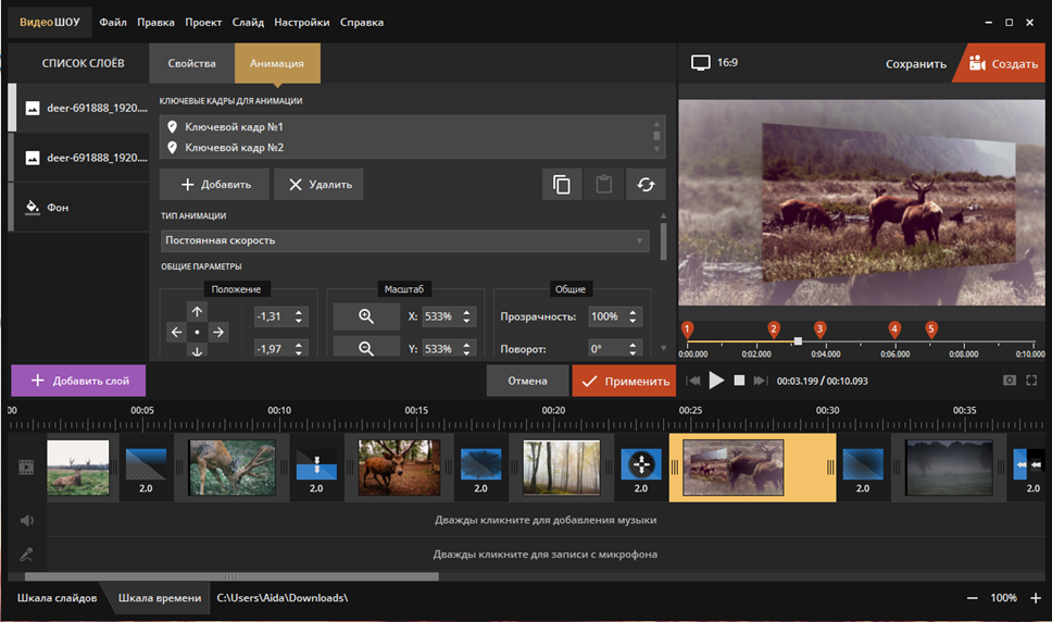 Здесь вы найдёте функции обрезки, накладывания слоёв, добавления музыки и записей с микрофона, огромный каталог готовых эффектов, заставок, титров, а также множество других удобных инструментов. Создавать яркие, эффектные клипы в ВидеоШОУ очень быстро и легко. Не только начинающие, но и продвинутые пользователи найдут здесь всё необходимое для работы с роликами.Посмотрите, как выглядит работа с видео в программе ВидеоШОУ
