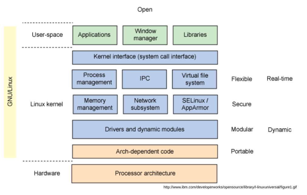 На базовом уровне он разделен на множество подсистем. Эти основные группы включают интерфейс системных вызовов, управление процессами, сетевой стек, управление памятью, виртуальную файловую систему и драйверы устройств.Администраторы могут портировать ядро Linux в свои операционные системы и запускать оперативные обновления. Эти функции, а также тот факт, что Linux является открытым исходным кодом, делают его более подходящим для серверных систем и сред, требующих обслуживания в режиме реального времени.