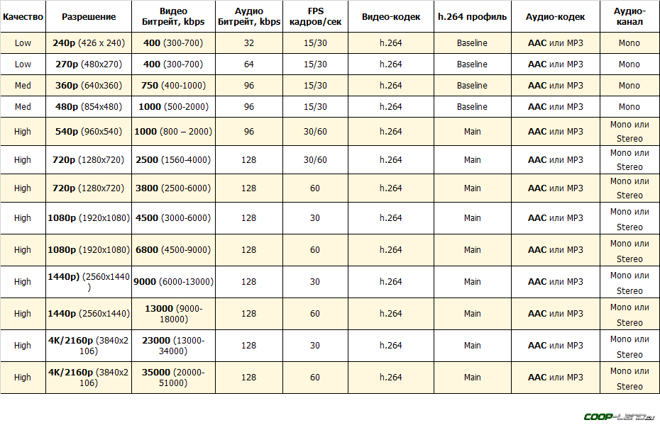 - Битрейт не ограничен строго, но полные рекомендации можно посмотреть здесь.