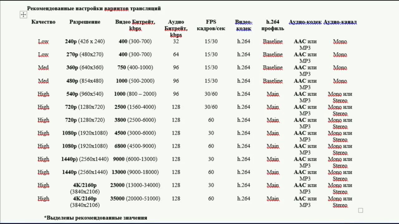 - Видеокодек h364 рекомендуется настраивать на прогрессивную развертку, переменный битрейт, цветовая субдискретизация 4:2:0, пара развернутых В-кадров.