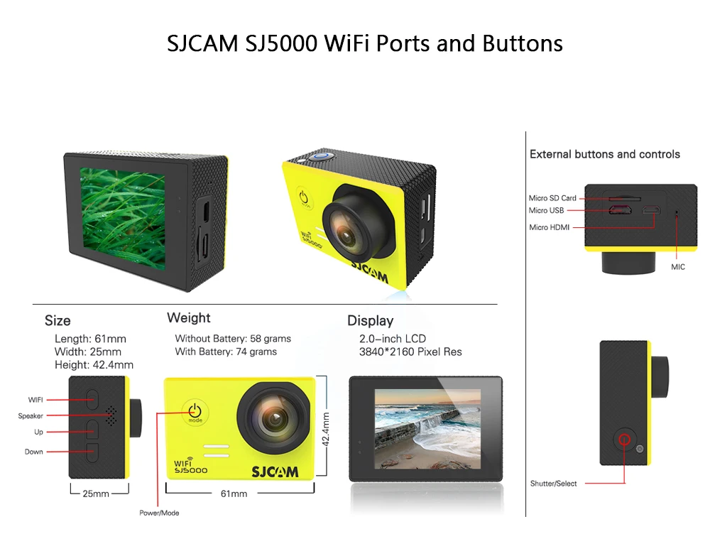 В отличие от предыдущих моделей GoPro, которые сами по себе являются водонепроницаемыми, для камеры SJCam требуется пластиковый корпус для защиты от воды, пыли и случайных ударов. В отличие от камер Yi, в комплект поставки SJCam входит чехол, а также ряд монтажных принадлежностей, как для крепления типа GoPro на пластиковом корпусе, так и для резьбового крепления штатива на нижней части камеры.