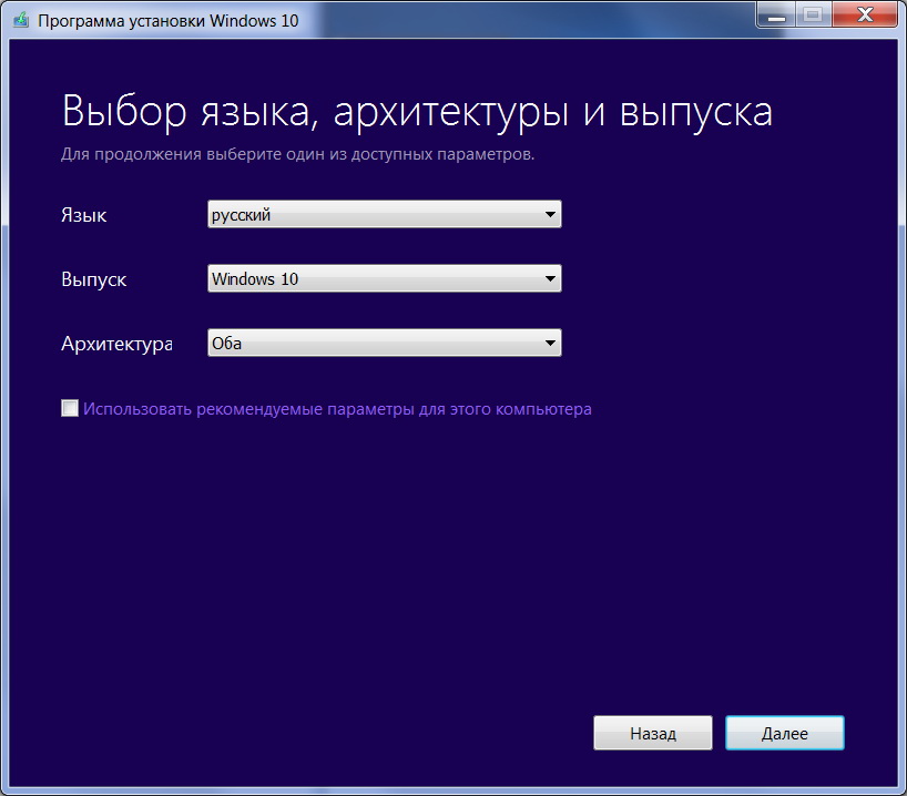 На следующей странице вы можете настроить параметры установки Windows 10. Если вам не нужны значения по умолчанию, снимите флажок «Использовать рекомендуемые параметры для этого ПК», а затем выберите нужный язык, выпуск и архитектуру. Когда вы закончите, нажмите «Далее».