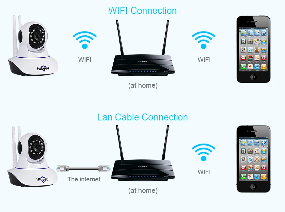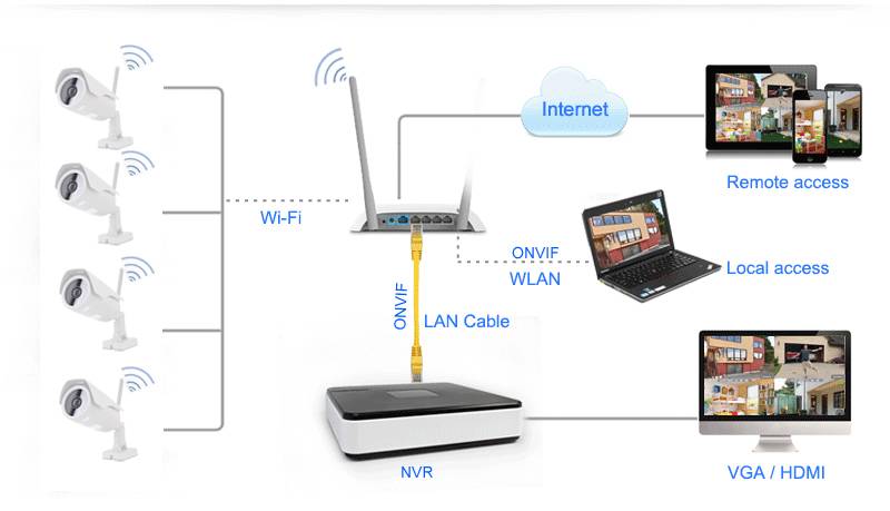 На схеме 1, камера передает видео и аудио данные через Wi-Fi к точке доступа, точка доступа передает данные через сетевой кабель на маршрутизатор (Router) или коммутатор (Switch), после чего данные отправляются на сетевой видеорегистратор (NVR), компьютер или даже напрямую в сеть Интернет для установки удаленного соединения с вашим мобильным устройством или уделенным ПК. Если используется NVR, вы можете записывать изображение наряду с другими подключенными к нему проводными камерами.