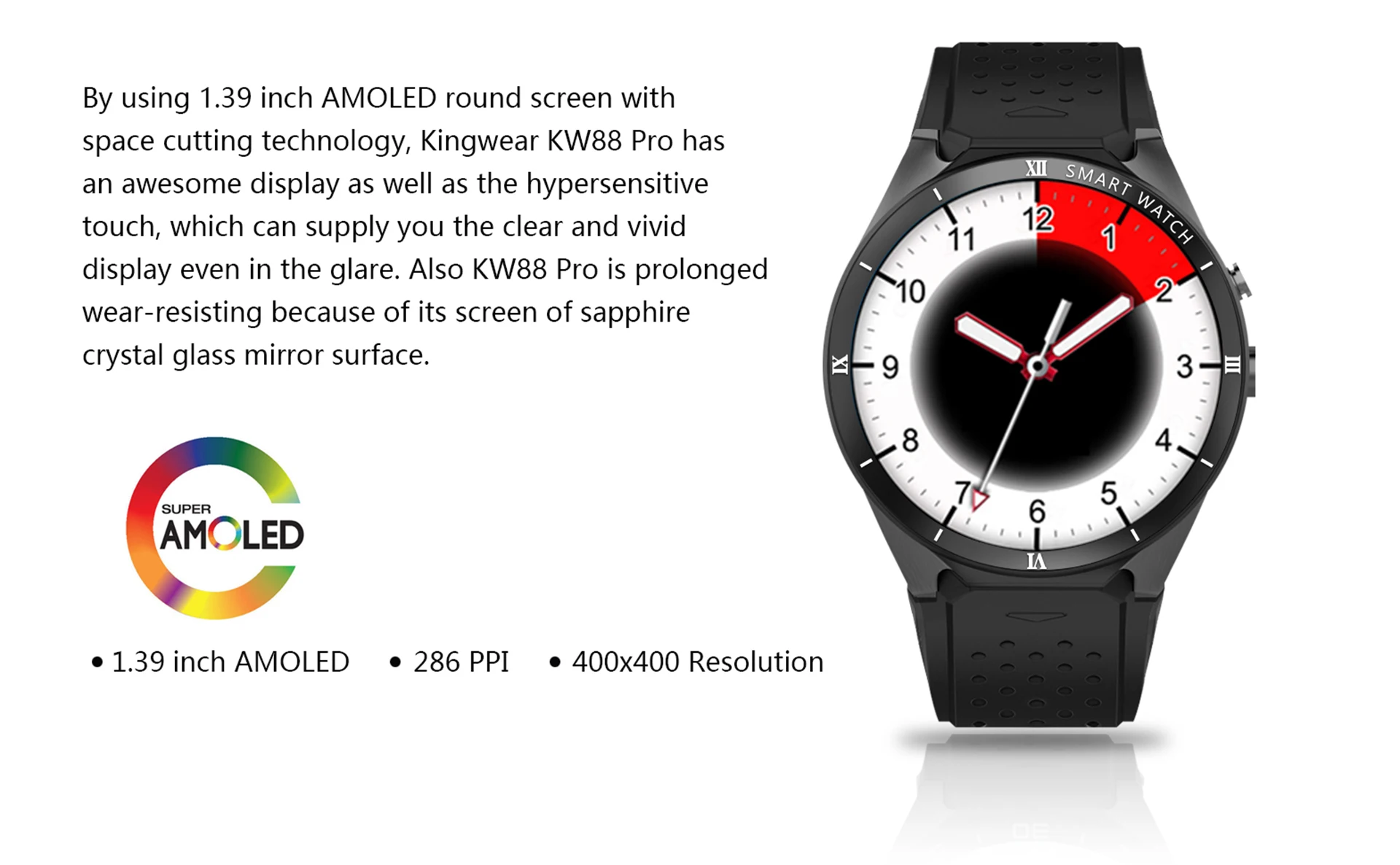KingWear KW88 Pro имеет 1,39-дюймовый дисплей Super AMOLED, защищенный сапфировым стеклом. 1,39-дюймовый дисплей обеспечивает потрясающее разрешение 400×400 пикселей. Разрешение в сочетании с дисплеем AMOLED показывает кристально чистые изображения / видео, яркие, живые и красочные. И у нас нет никаких претензий к качеству дисплея.