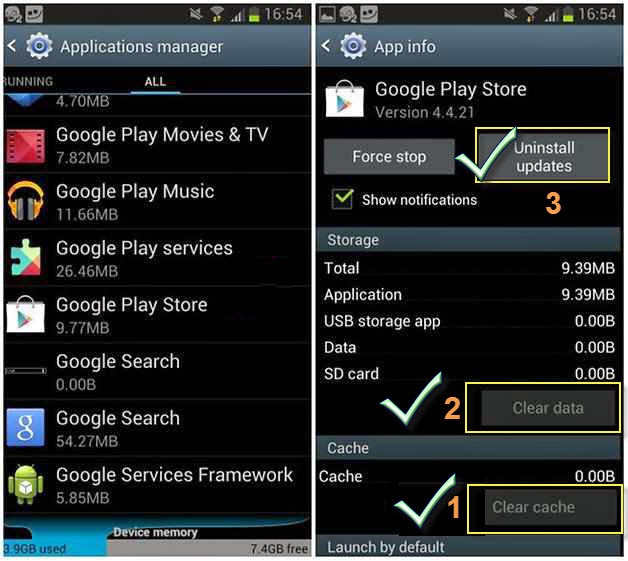 - Очистить кеш и очистить данные магазина Google Play, службы Google Play и диспетчера загрузок.