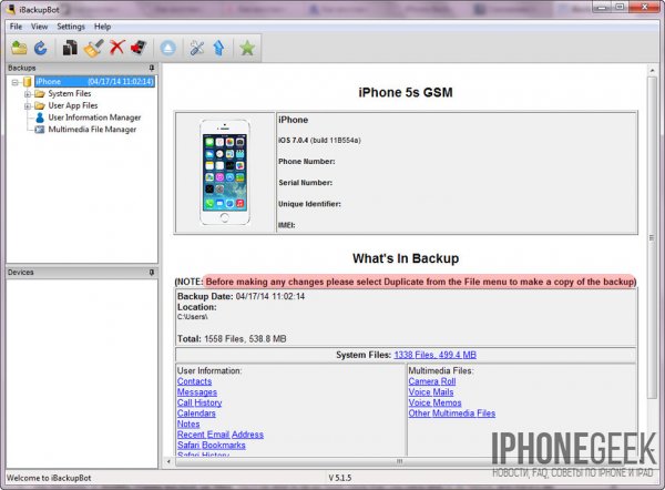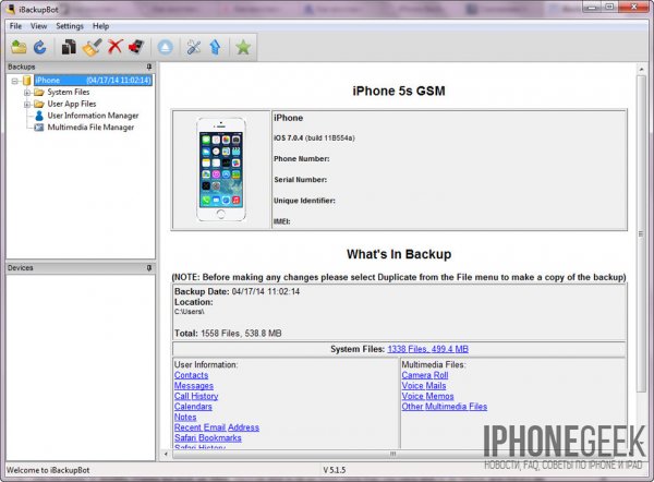 - В главном окне программы будет отображена информация о резервной копии, а имено: название устройства, версия iOS, номер телефона, серийный номер устройства, уникальный идентификатор и IMEI.