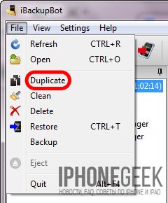 - В меню «File» (Файл) выберите пункт «Duplicate» и выберите место на локальном диске куда сохранить дубликат. Создать дубликат можно из контекстного меню вызываемого правой кнопкой мыши на названии резервной копии в окне «Backups» или нажатием на соответствующий ярлык в Панели инструментов программы.