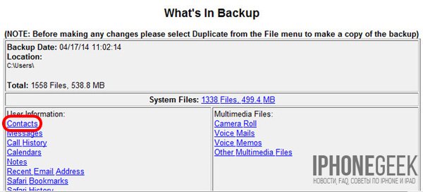 Восстановление отдельных контактов из iTunes