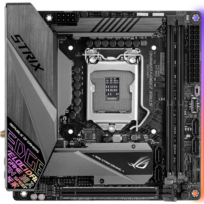 Геймерская материнская плата формата ATX с чипсетом Intel Z390, поддержкой DDR4 4266 МГц и выше, Aura Sync RGB, Wi-Fi 802.11ac, двумя разъемами M.2 с радиаторами, портами SATA 6 Гбит/с, HDMI и USB 3.1 Gen 2