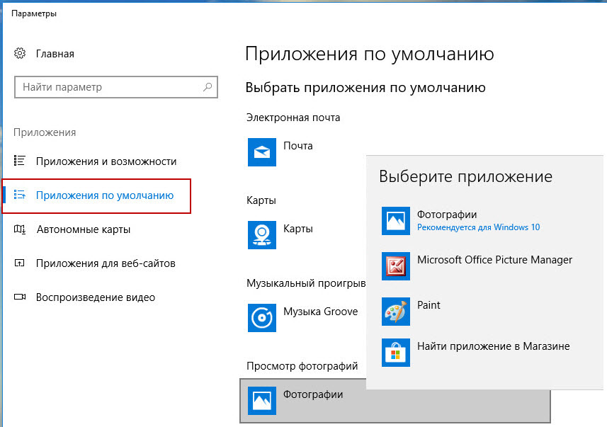 - Найдите приложения по умолчанию и в приложениях по умолчанию установите Windows Photo Viewer по умолчанию в средстве просмотра фотографий.